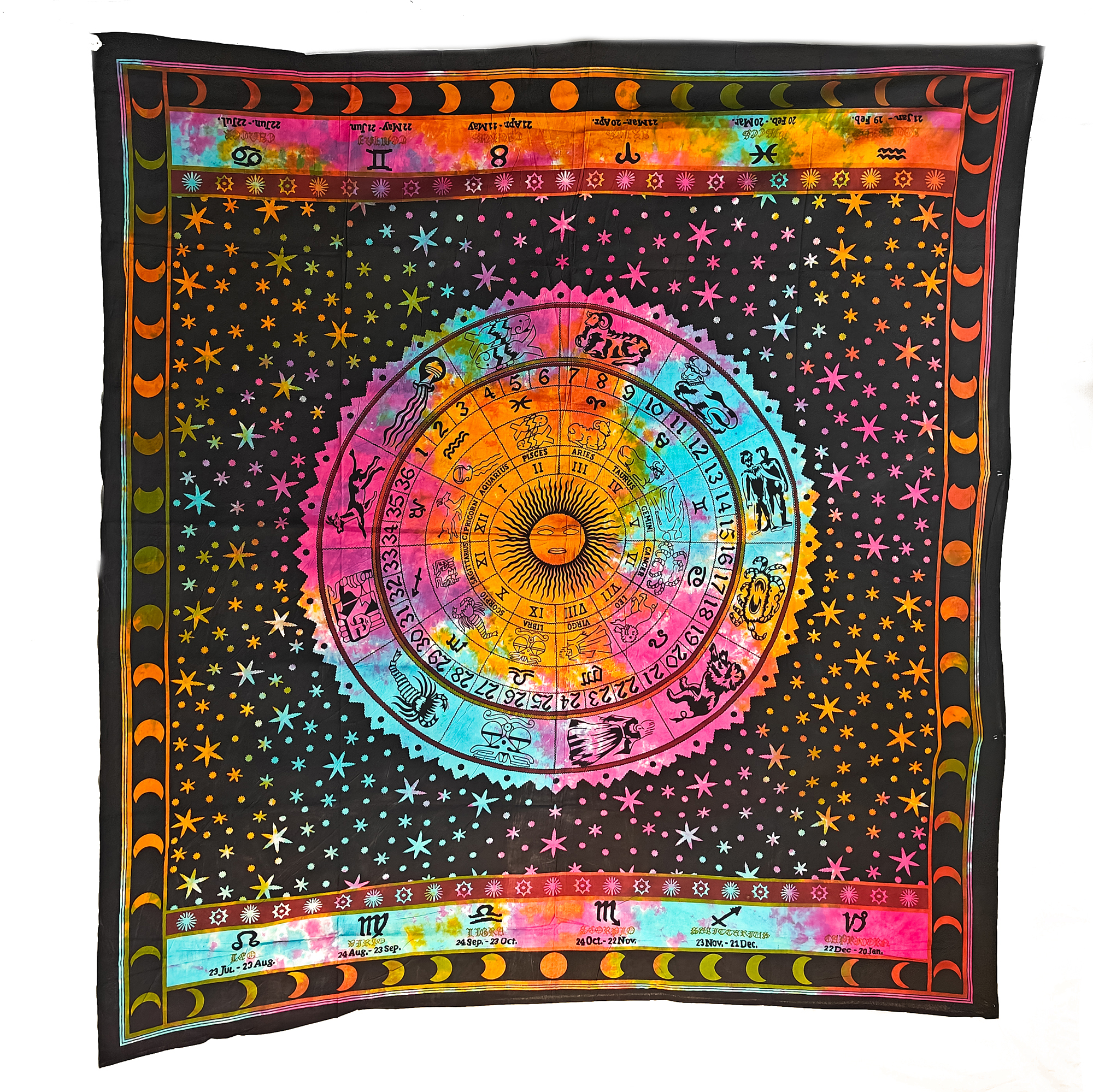 Connect with the celestial energies of the universe with our mesmerizing Tie-Dye Zodiac Wheel of Life Tapestry. This captivating wall hanging features a vibrant depiction of the zodiac wheel, symbolizing the cyclical nature of life and the influence of celestial bodies.